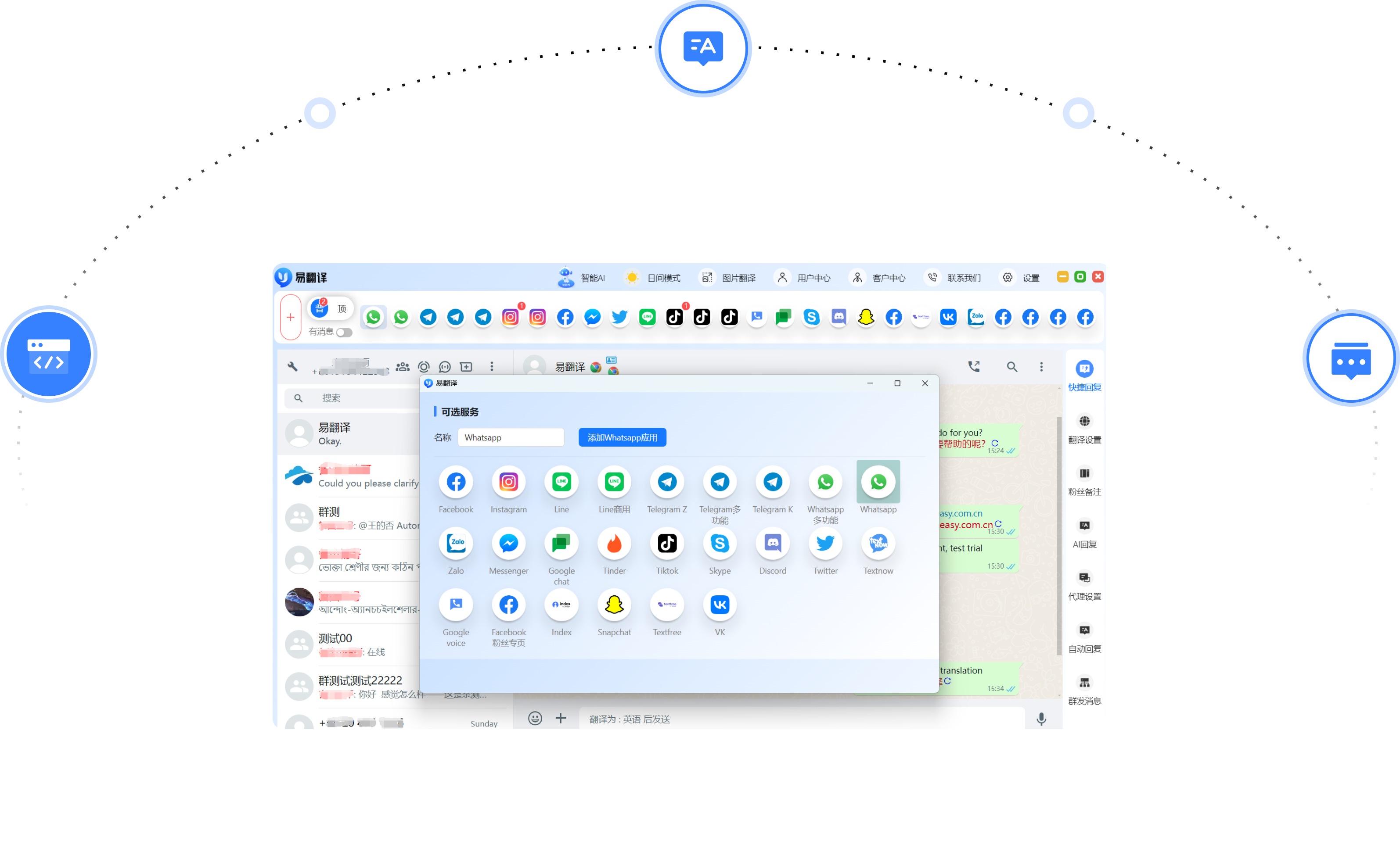 易翻译集成了whatsapp/line/zalo/telegram等全球主流社交软件